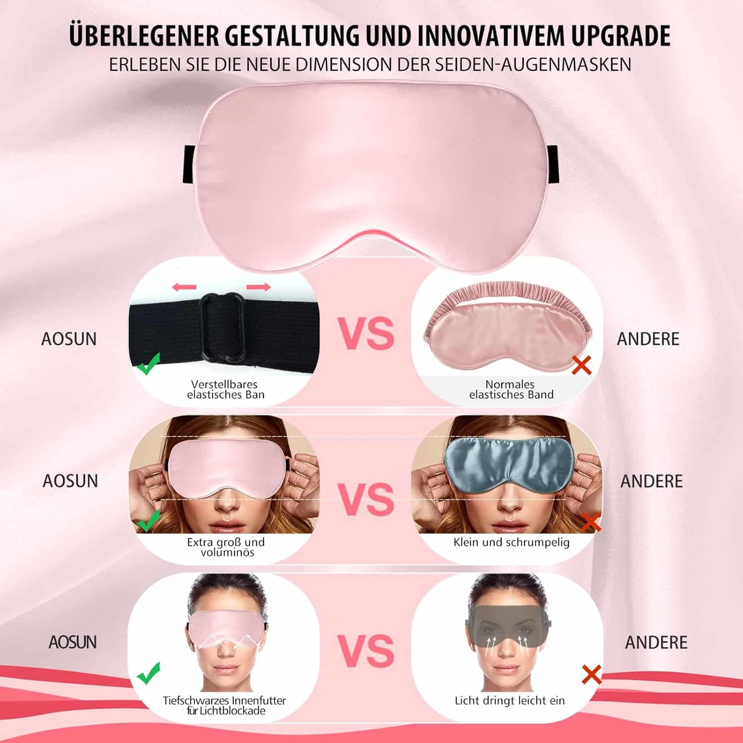 Aosun siidist unemask külili magajatele – 100% orgaaniline mooruspuu siid, 98% valgusblokeeriv, reguleeritav rihm, pale pink